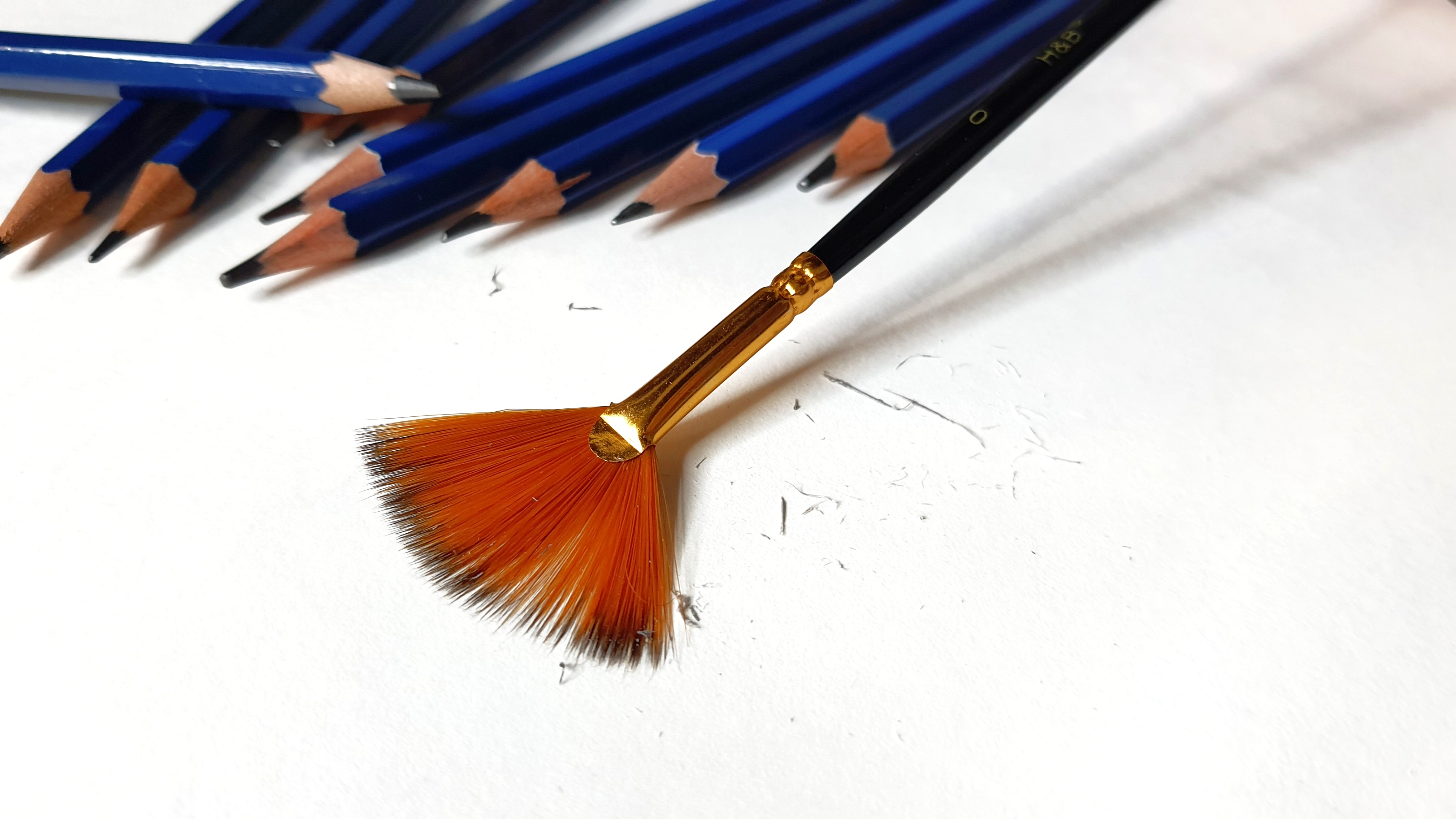Jak już wspomniałam, gumka chlebowa nie pozostawia po sobie “resztek”, niestety zwykła może zostawić ich całkiem sporo. Przyda się więc duży pędzel, aby resztki gumki lub grafitu ściągnąć bez brudzenia rysunku.