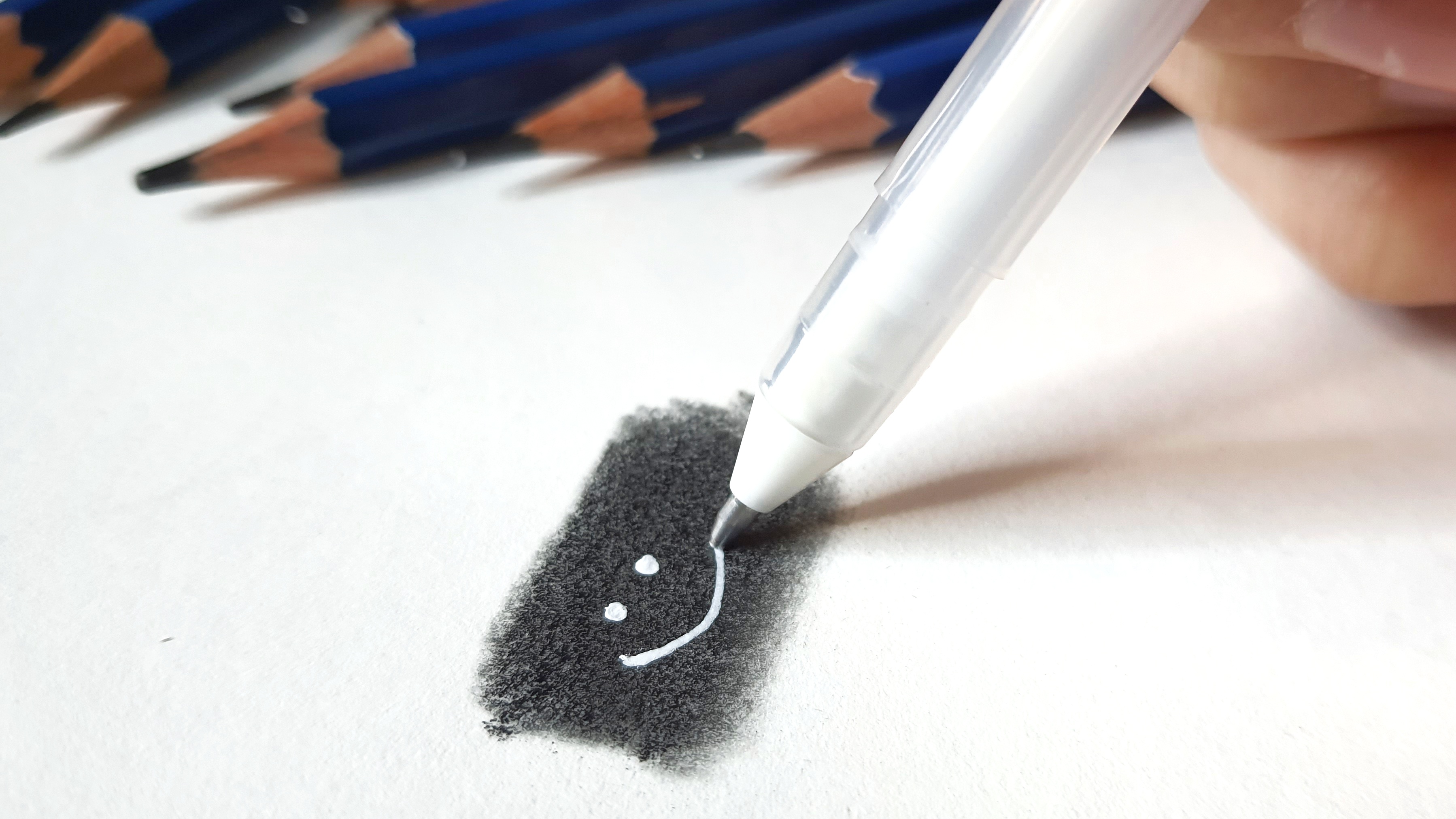 Na koniec zostaje nam tylko biały żelopis. Używa się go do wykończenia rysunku. Do narysowania odbić światła w oczach, do drobnych wzorów i elementów, czy do podkreślenia czegoś błyszczącego.
