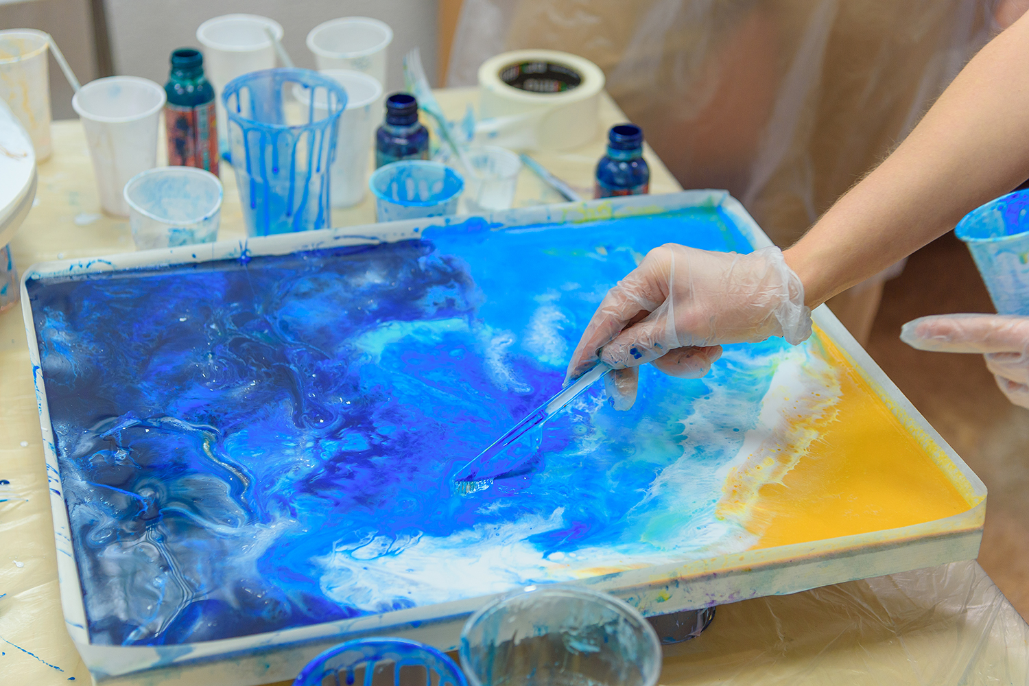 Osoby, które dotychczas miały niewiele wspólnego z malarstwem powinny na samym początku wybrać do pouringu bezpieczne zestawy kolorów. Nie wszystko do siebie będzie pasować. Najlepiej stosować kolory, które będą ze sobą kontrastować. Można też czerpać inspirację od osób, które zajmują się wylewaniem i spróbować z takimi kolorami, które one zastosowały. Moim ulubionym zestawem jest niebieski, róż oraz biel.
