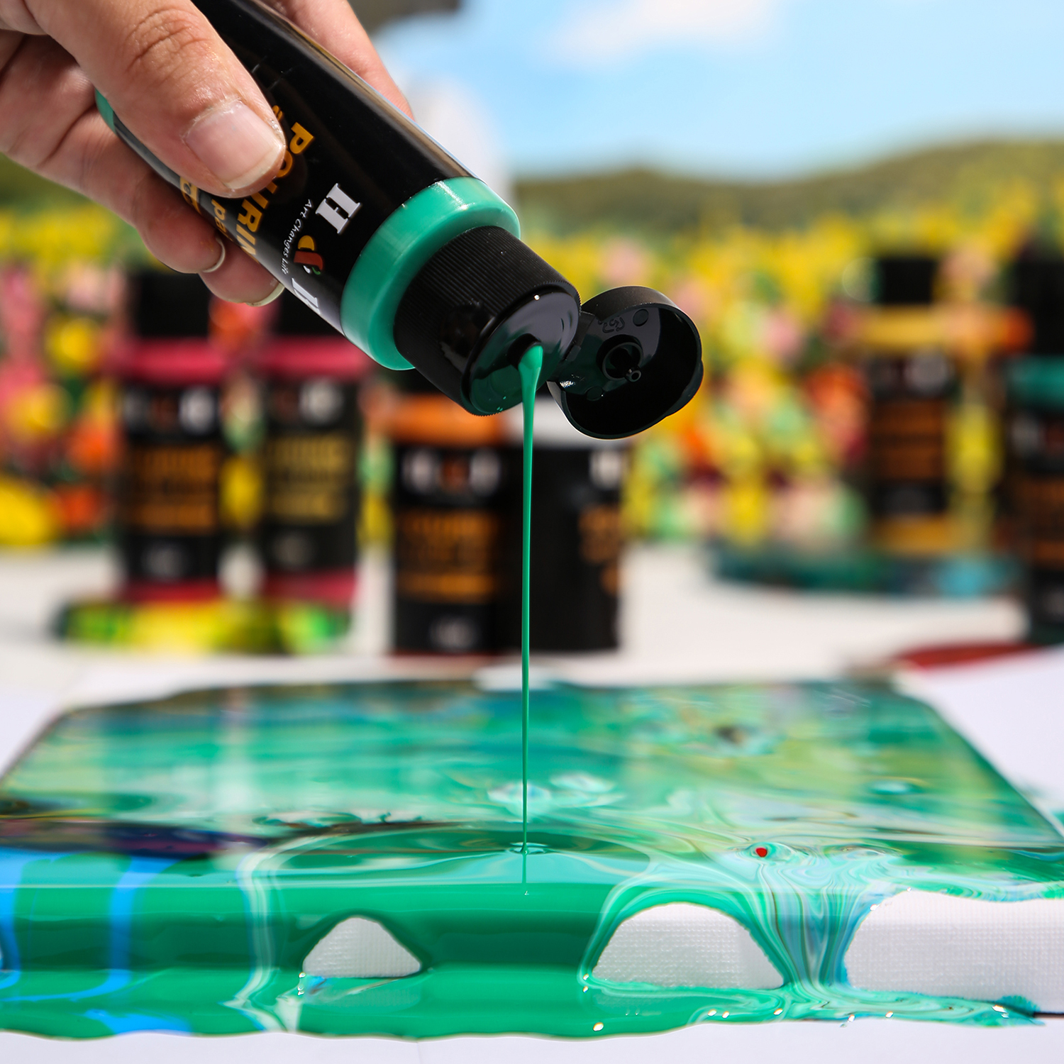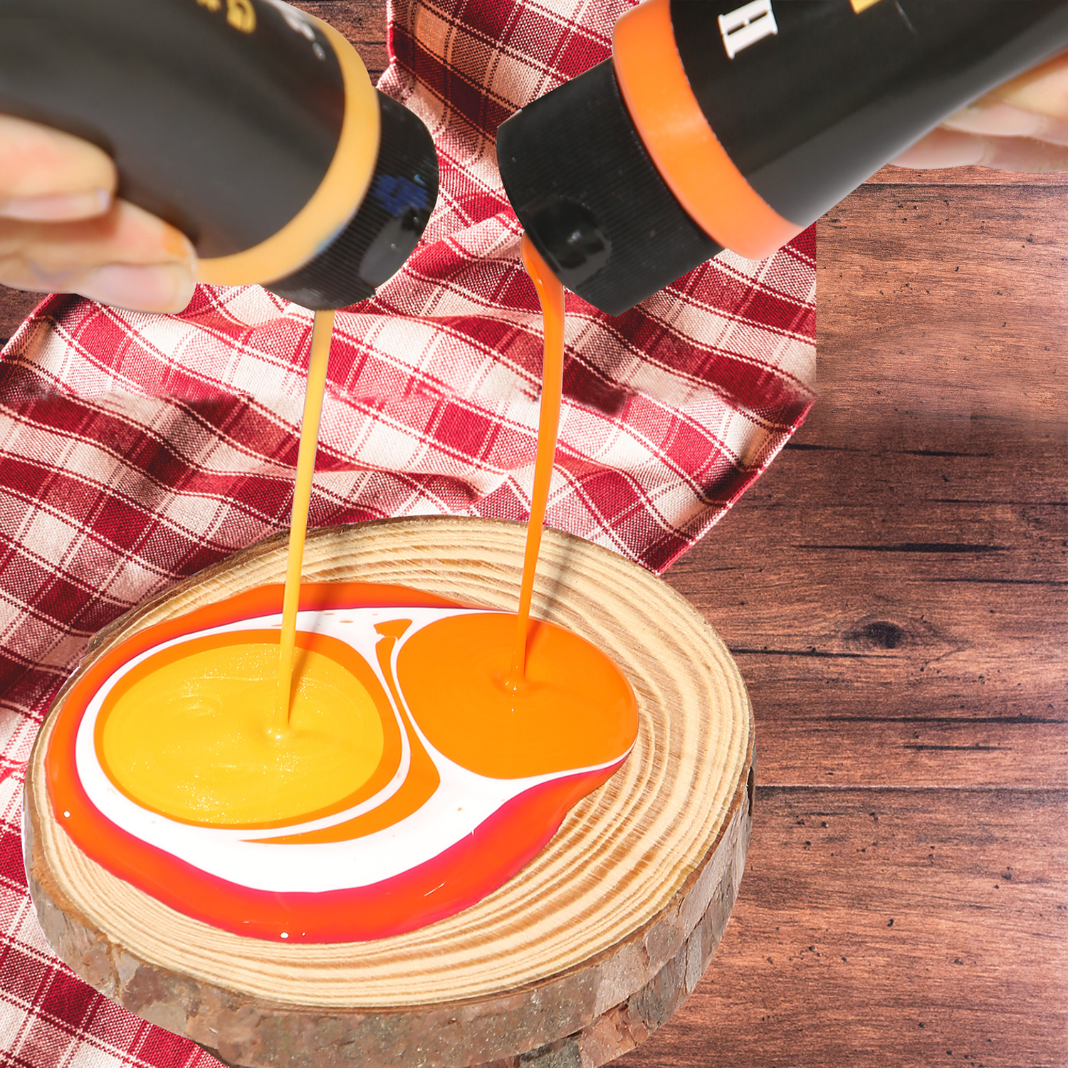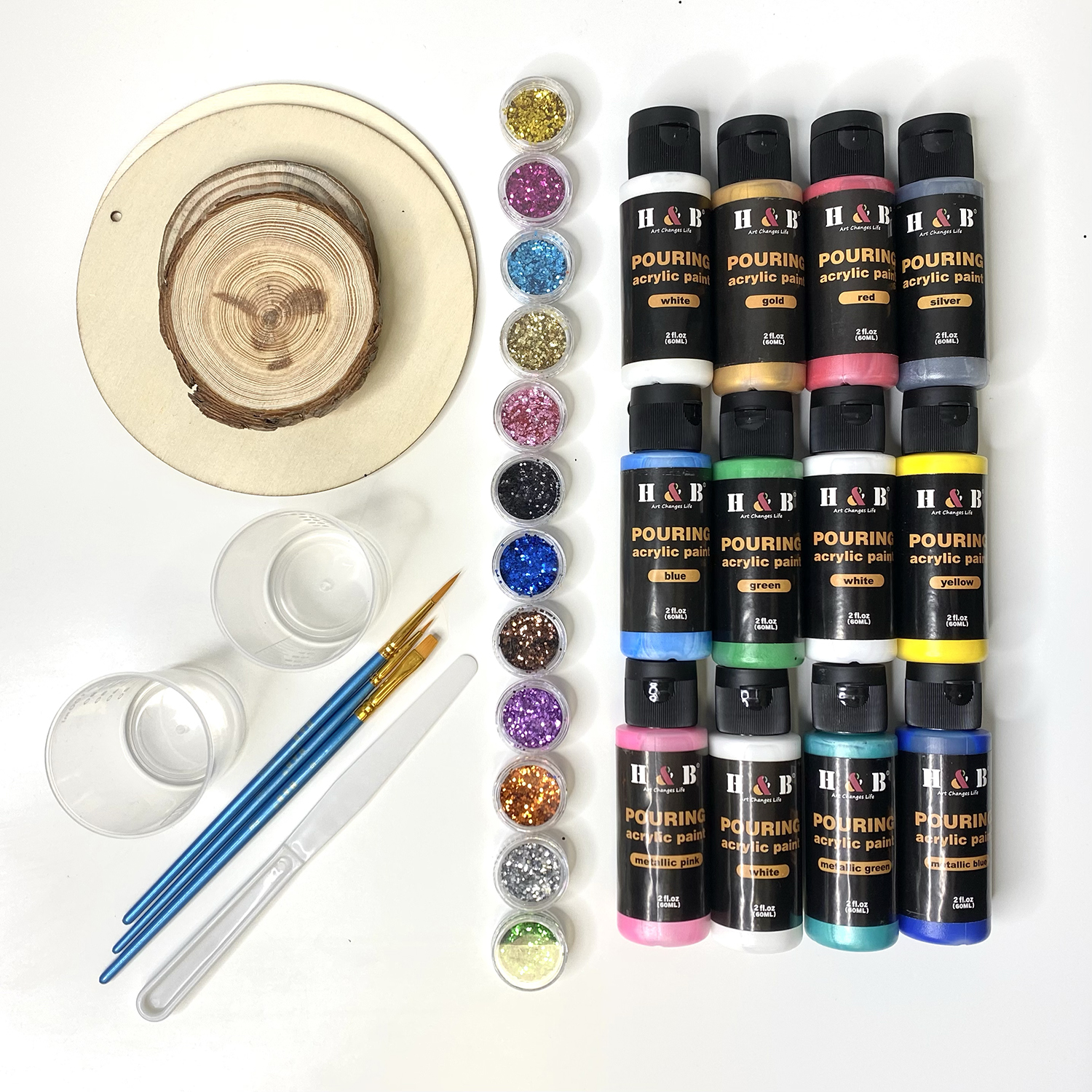 Wydaję mi się, że przygotowanie odpowiedniej mieszanki pod wylewanie obrazu stanowi połowę sukcesu. Niełatwo jest uzyskać taką samą konsystencję z każdej z farb po zmieszaniu z medium, dlatego na początku przygody z pouringiem polecam nasz gotowy zestaw do pouringu. Będziesz miał pewność, że farby są odpowiednio przygotowane do wylewania. W zestawie oprócz farb są różne dodatki np w postaci 12 kolorów brokatu, pędzelki i wiele innych.