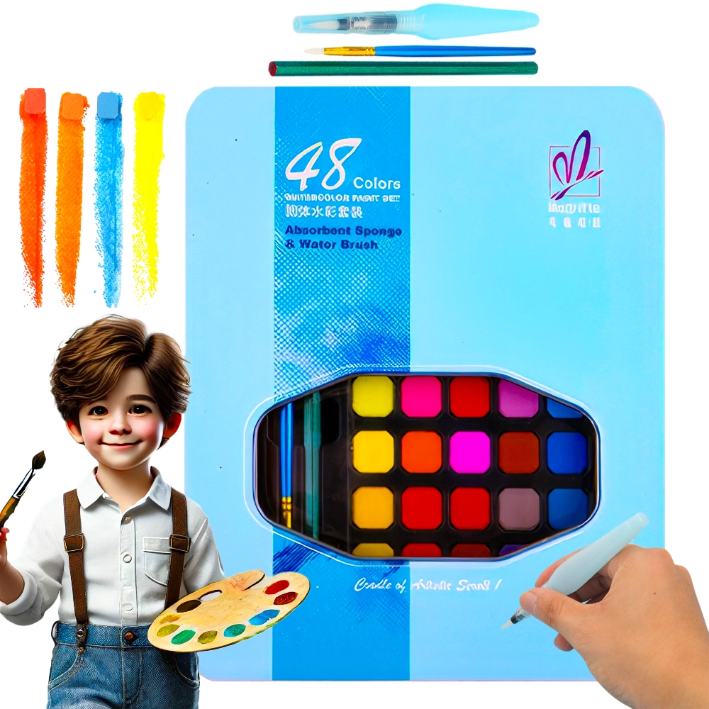 ✍️ Odkryj radość malowania z naszym wyjątkowym zestawem farb wodnych, zawierającym 48 żywych kolorów, zamkniętych w poręcznym etui.